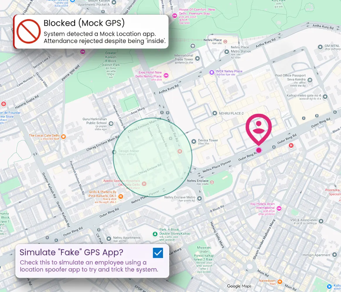 Our system detects fake GPS apps. If they aren't at the client site, they can't clock in