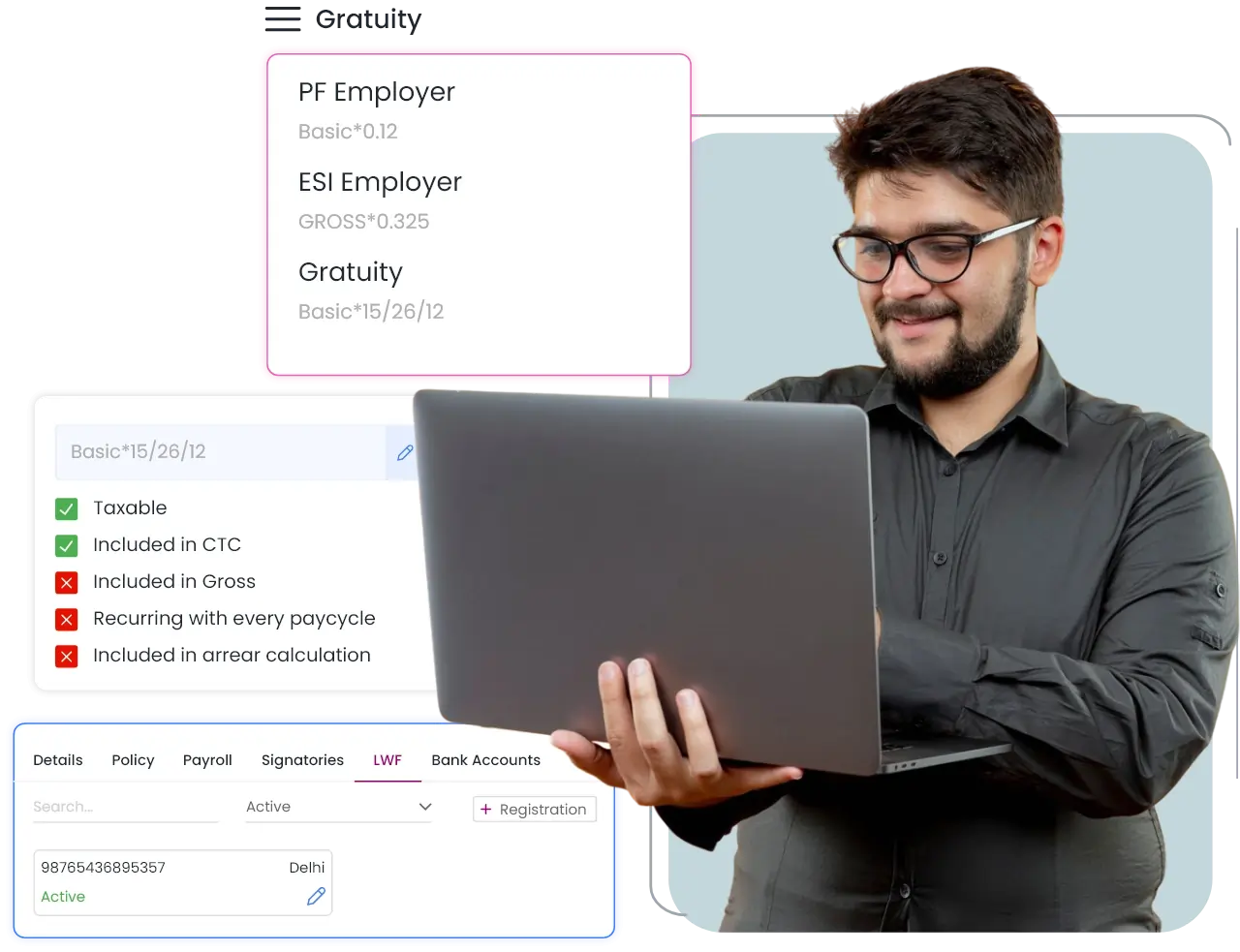 QkrHR ensures organizations stay compliant with labor laws by managing calculations, deductions, and reporting for PF, ESI, PT, Gratuity, and LWF. It simplifies statutory processes and reduces compliance risks.