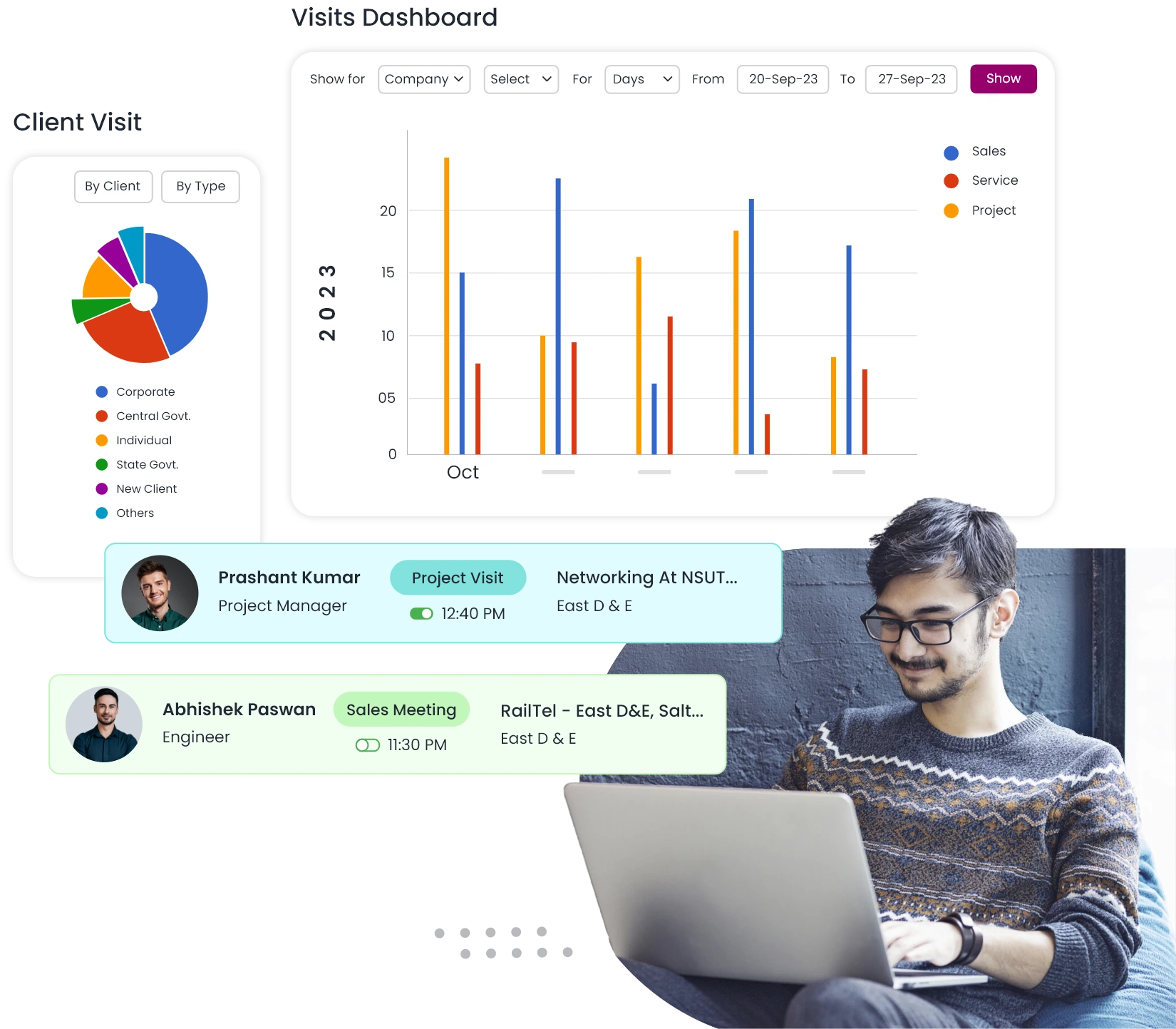 QkrHR for sales, service, and project visits tracking for each customer, order, project, or ticket, as well as full HRMS functions.