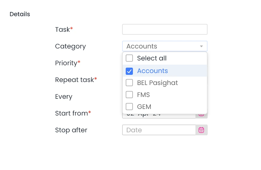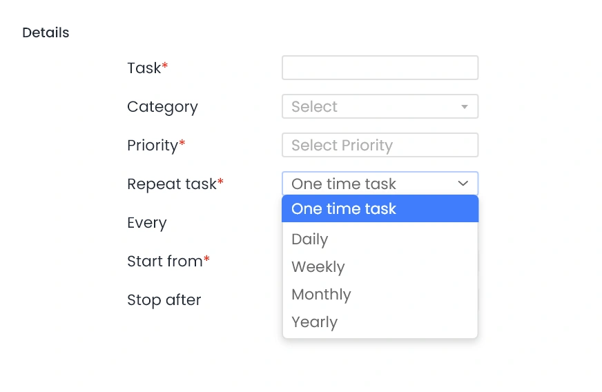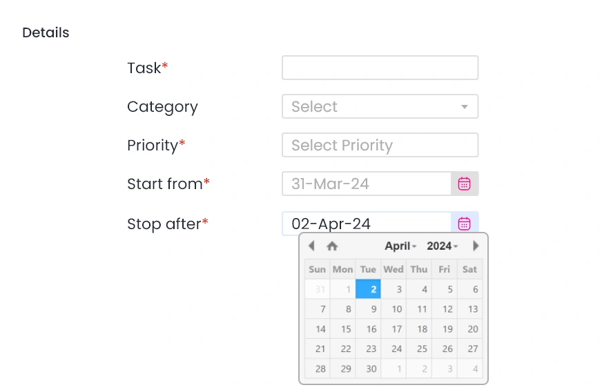 Stop after date let’s you specify the date until which recurring activity will be assigned. The task is assigned continuously if no stop after date is specified.
